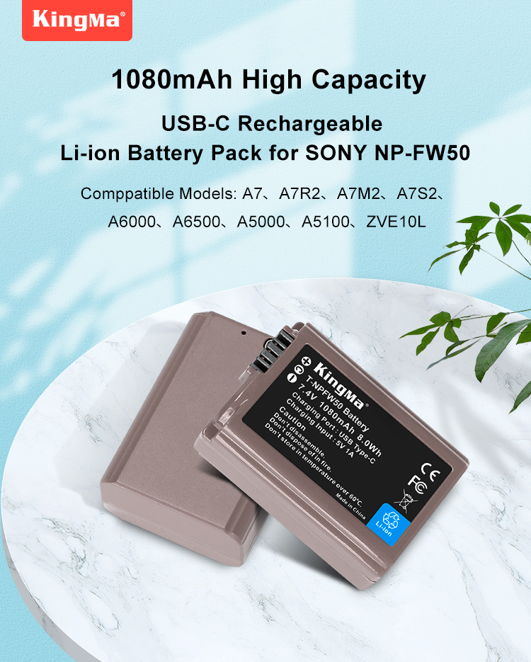 KingMa USB-C Input NP-FW50 1030mAh Battery with Protective Box for Sony ZV-E10, ZV-E10L, a6500, a6400, a6300, a7M2, a7RM2, a7SM2, DSC-RX10 Mark II/III/IV, NEX-7/6/5/3
