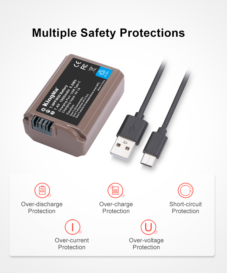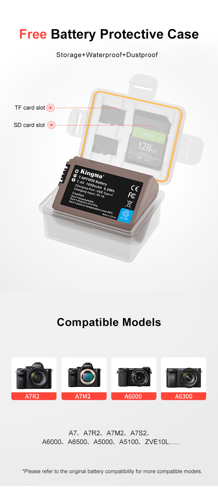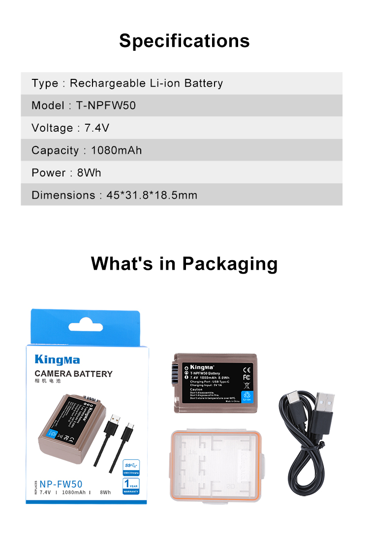 / KingMa USB-C Input NP-FW50 1030mAh Battery with Protective Box for Sony ZV-E10, ZV-E10L, a6500, a6400, a6300, a7M2, a7RM2, a7SM2, DSC-RX10 Mark II/III/IV, NEX-7/6/5/3